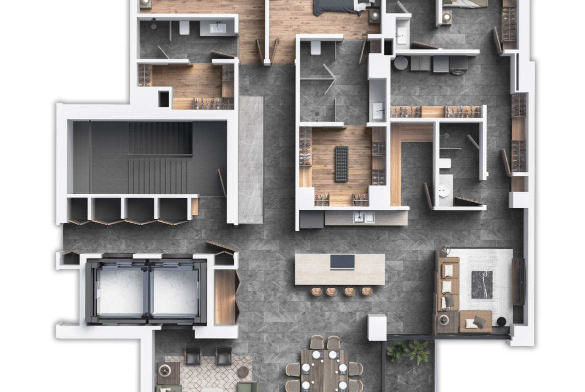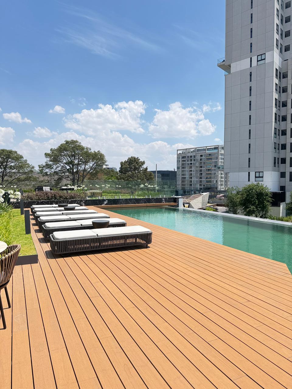 • Cocinas: Manufacturadas por MOBILE en México con insumos importados, los interiores en melanina son originarios de chile y las puertas o paneles son procedentes de España, las correderas y bisagras cuentan con el sistema de cierre lento con cubierta y black splash de cuarzo de Portugal.